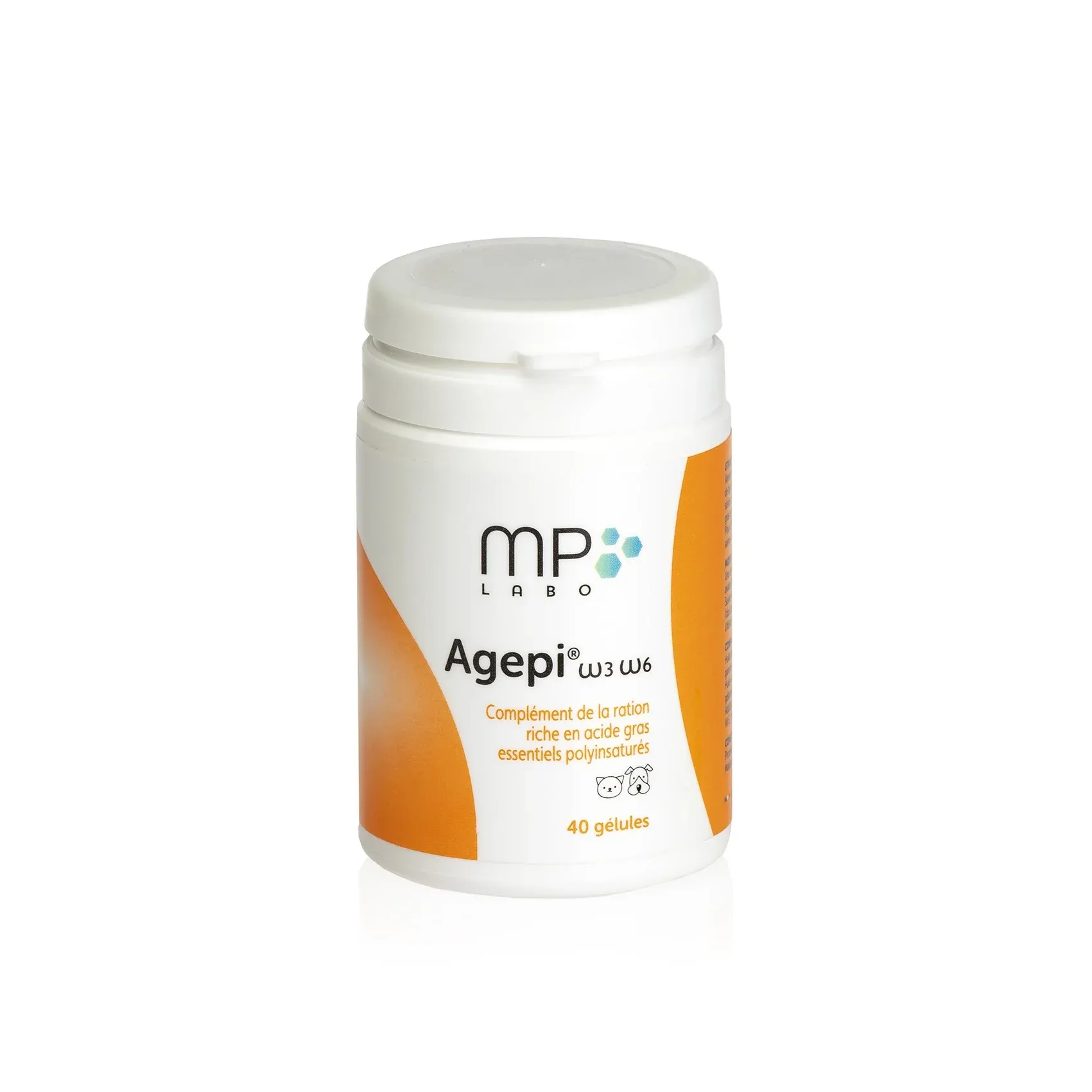 Agepi Omega 3 Omega 6 est un complément alimentaire pour chiens et chats. Ces capsules d’Acides Gras Essentiels Polyinsaturés (OMEGA 6 et OMEGA 3), contenant également des vitamines A et E, permettent l’obtention d’un pelage brillant et soyeux et d’une peau saine et souple (mues, concours, alopécie…).