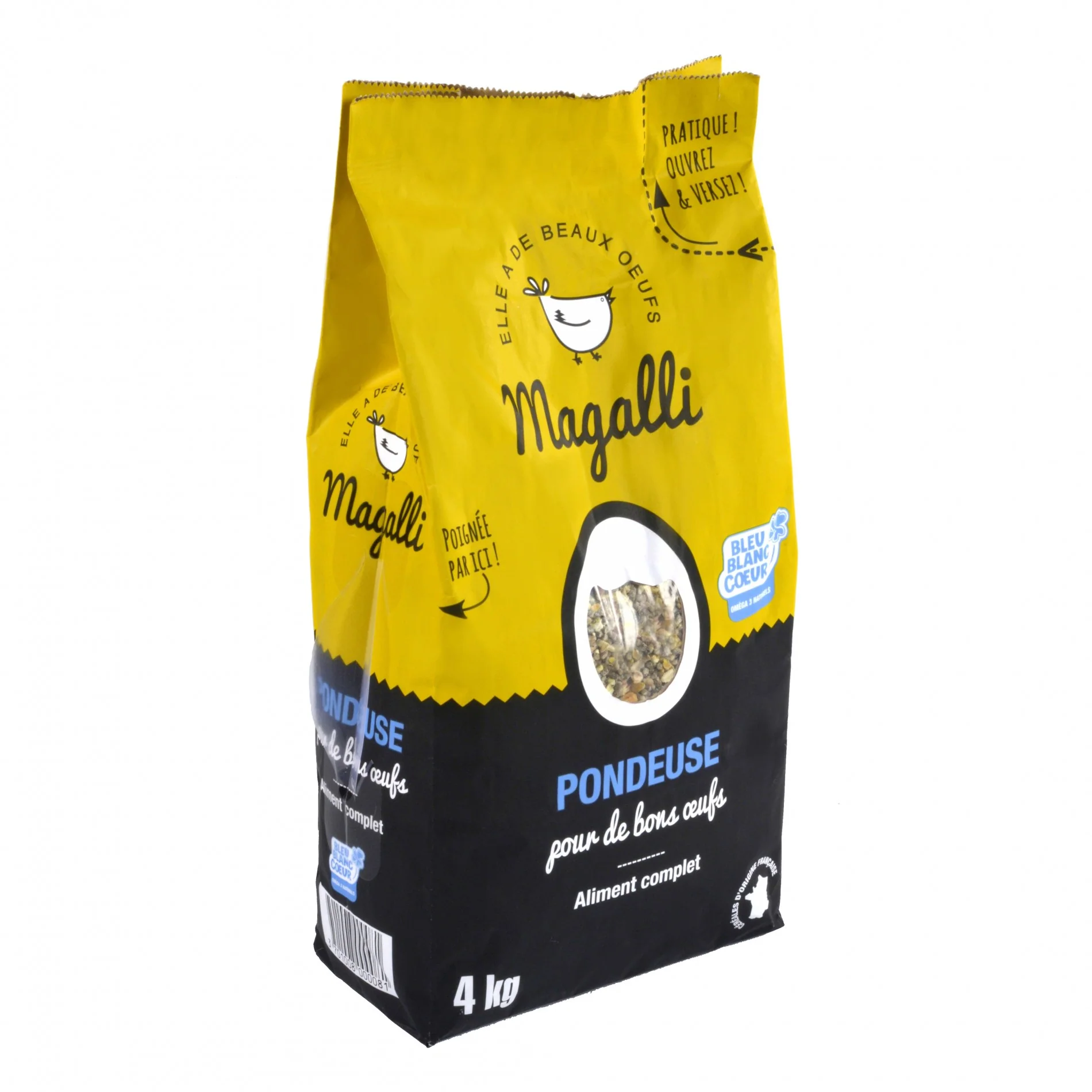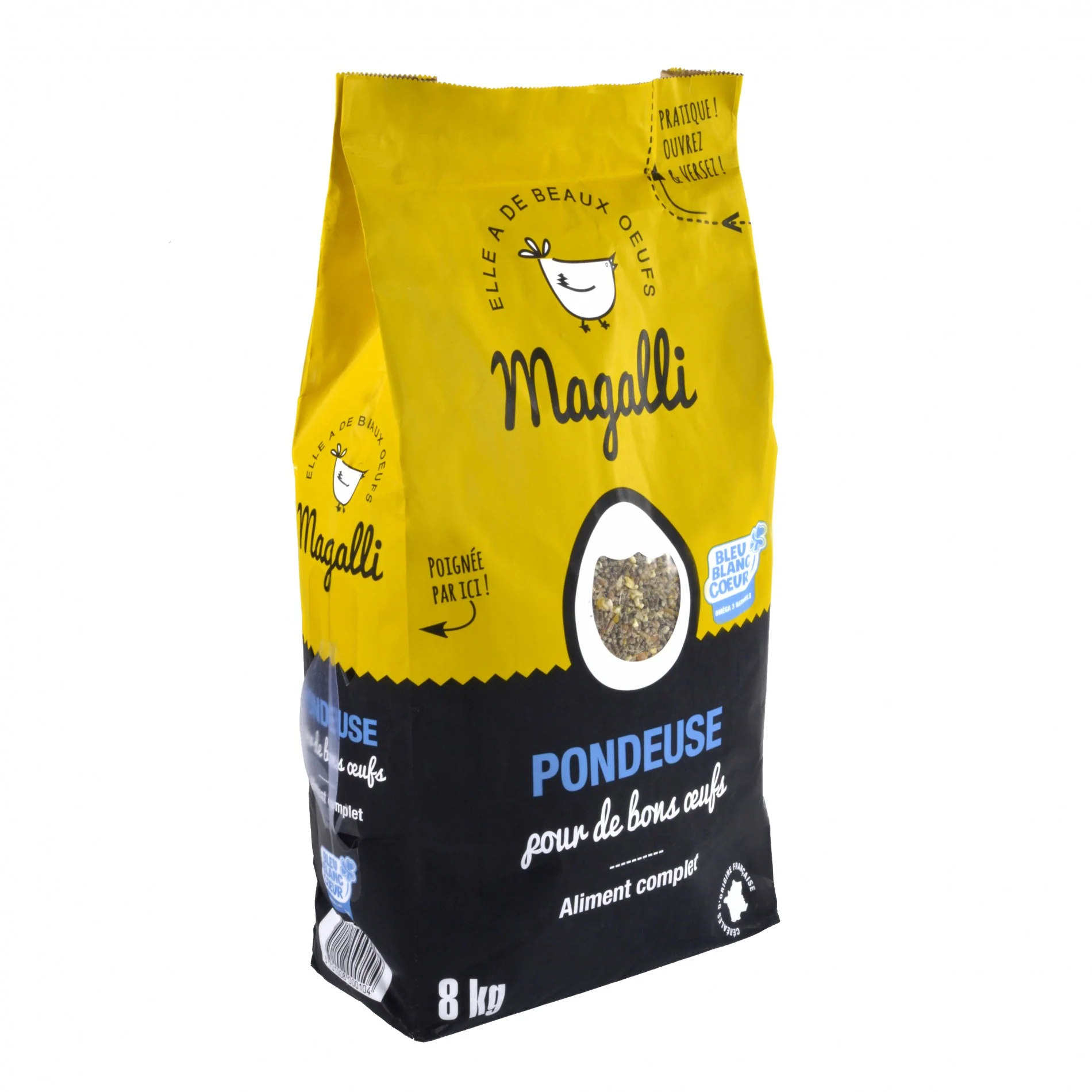 L’aliment complet Pondeuse Magalli respecte la charte de l’association Bleu-Blanc-Cœur. Celle-ci s’est notamment engagée à améliorer la teneur en acides gras oméga-3 de notre alimentation.