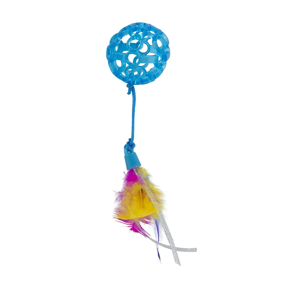 Spécialement conçue pour les chats grâce à sa forme et sa matière en caoutchouc souple, cette balle promet des heures de jeu à votre chat. Ses petits trous permettront à votre compagnon de l’attraper facilement et ses plumes éveilleront son instinct de chasseur !