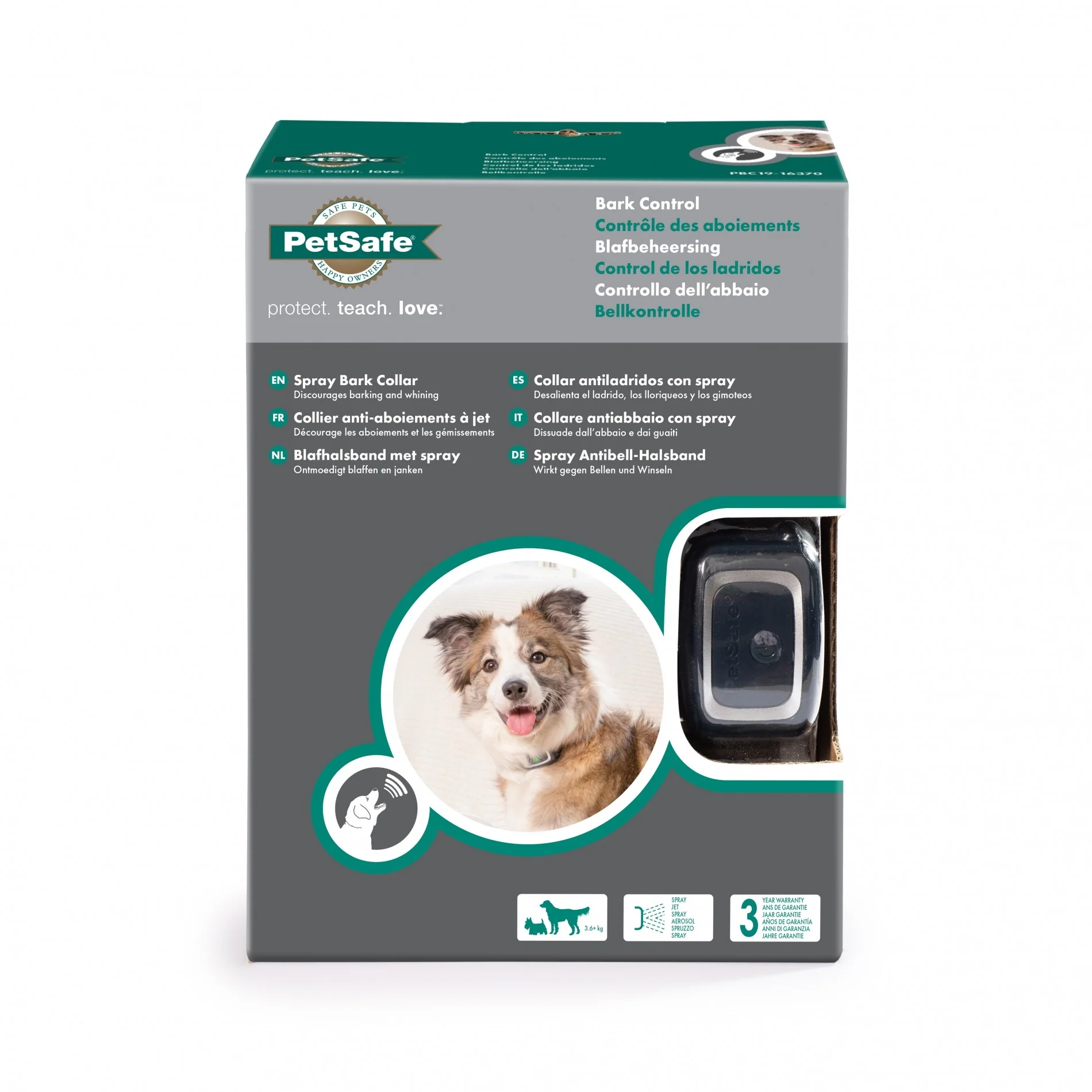 Le collier anti-aboiement à spray rechargeable Petsafe PBC19-16370 est conçu pour les chiens de toutes tailles pesant plus de 3,6 kg et vise à faire cesser les aboiements intempestifs.