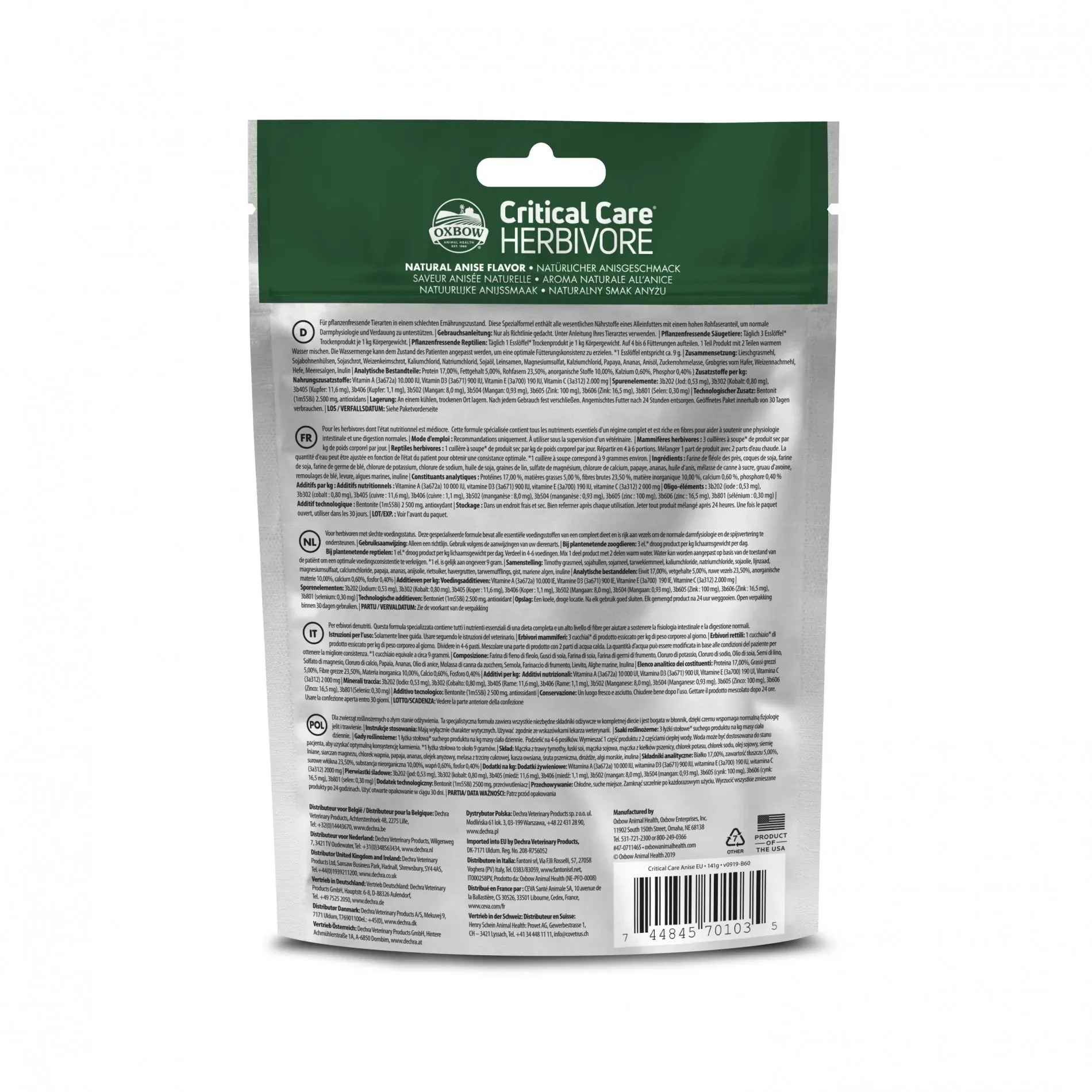 L’aliment Critical care d’oxbow contient tous les nutriments essentiels à une diète équilibrée et de la phléole des prés à haute teneur en fibres qui contribue à une physiologie intestinale optimale et à une digestion saine.