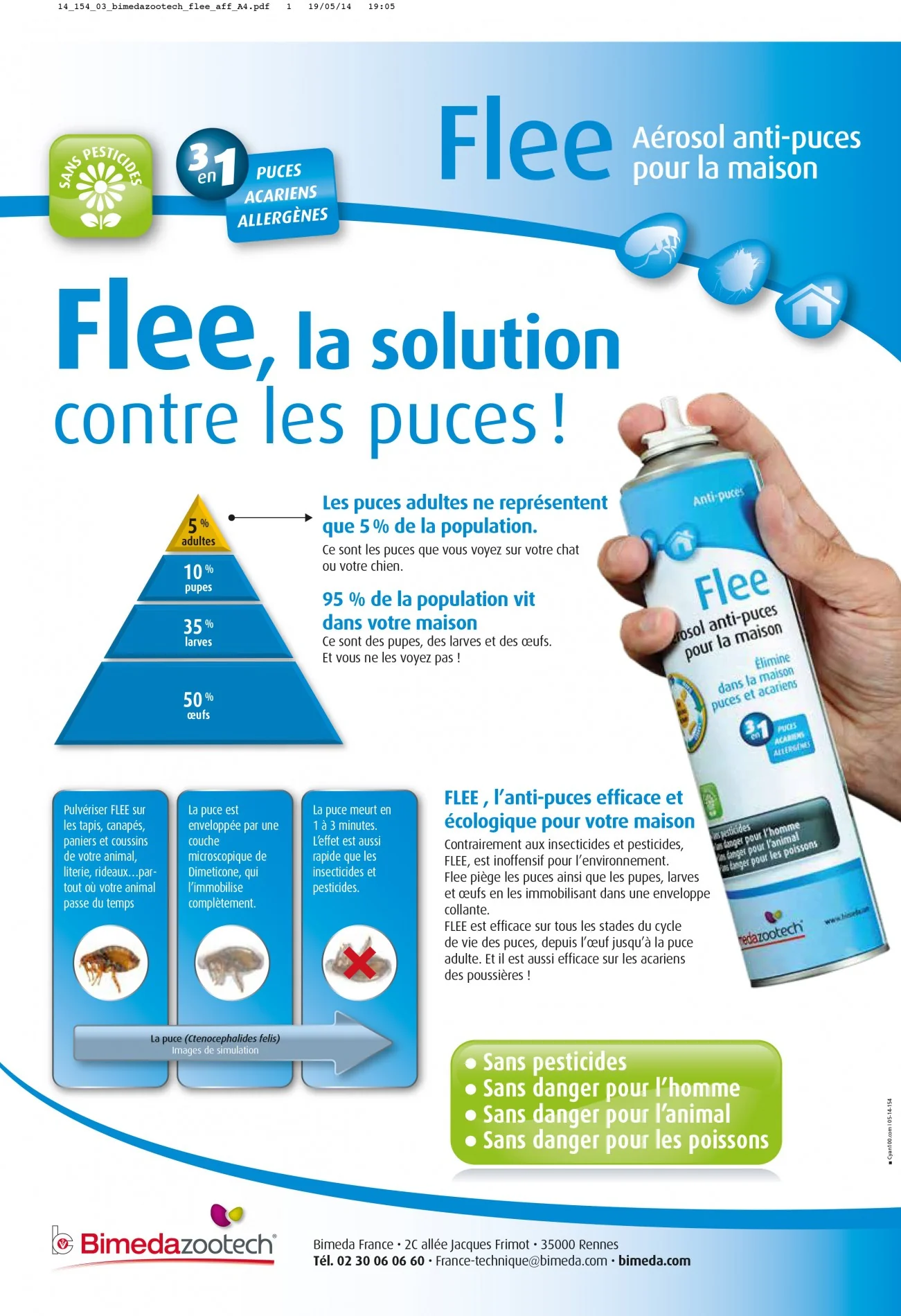 Flee est un aérosol anti-puces pour la maison qui permet d’éliminer tous les stades du cycle de vie des puces, depuis l’oeuf jusqu’à la puce adulte. Contrairement aux insecticides et pesticides, Flee est inoffensif pour l’environnement.