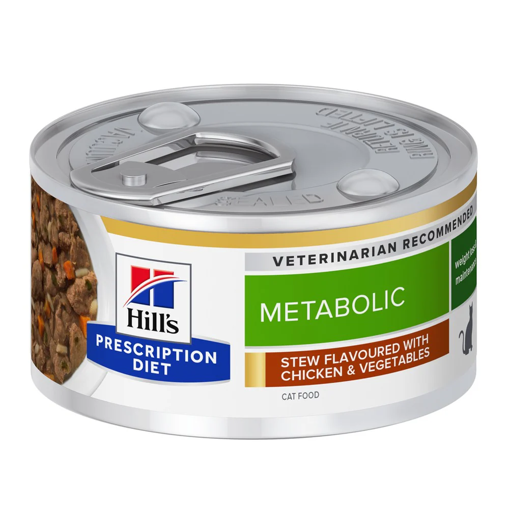 HILL’S Prescription Diet Metabolic est une pâtée en bouchées mijotées au poulet et petits légumes, conçue pour favoriser la perte de poids et maintenir un poids de forme chez le chat adulte et senior sujet à l’obésité.