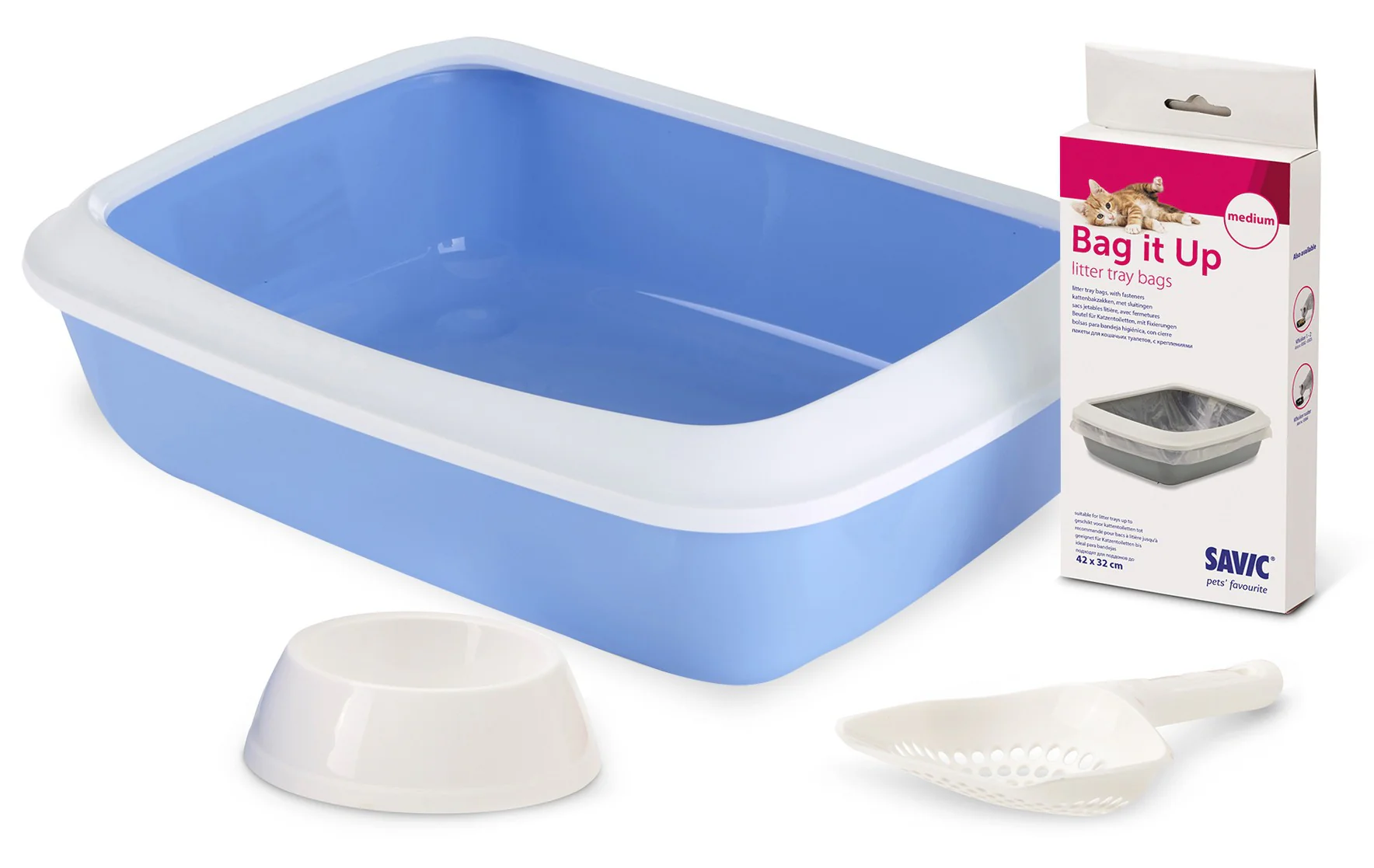 - Contient un bac à litière, une pelle et une pochette de 12 sacs à litière ainsi qu’une gamelle