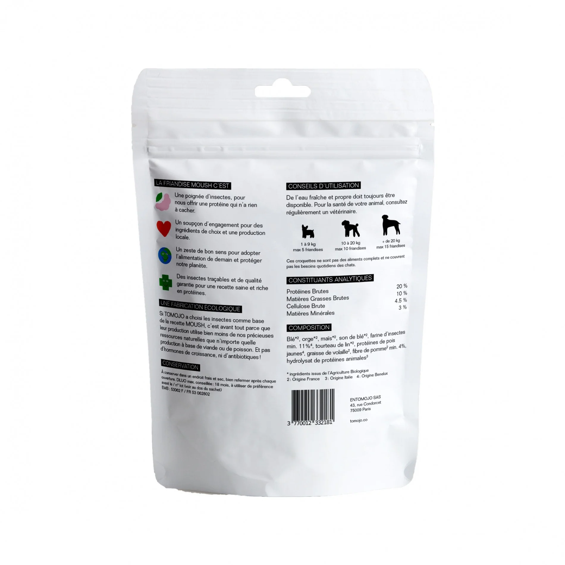 • Élaborées avec de la farine d’insectes, source de protéines de qualité.