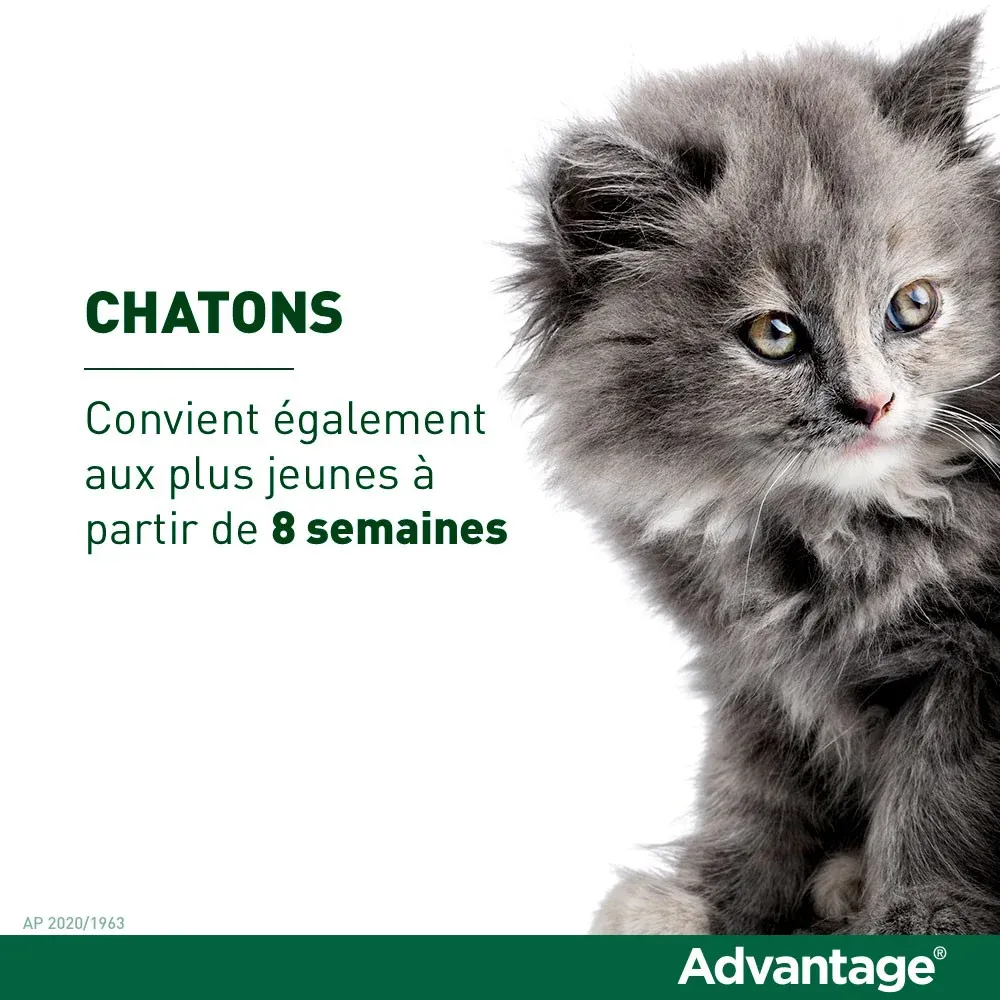 Les pipettes Advantage offrent une protection efficace contre les puces en éliminant les infestations et prévenant les récidives pendant 3 à 4 semaines. Appliquée en un seul point, la solution se répartit sur tout le corps et agit par simple contact avec les parasites.