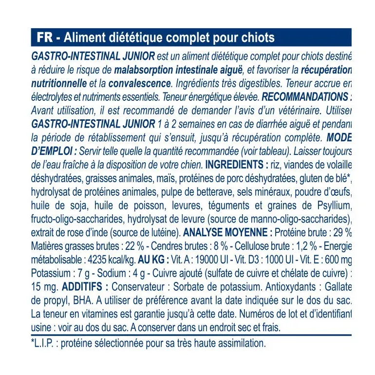 L’aliment Royal Canin Gastro Intestinal Puppy n’est pas recommandé en cas de lymphangiectasie, d’entéropathie exsudative, de pancréatite, d’hyperlipidémie, de toutes les pathologies pour lesquelles une alimentation pauvre au graisses est recommandée.