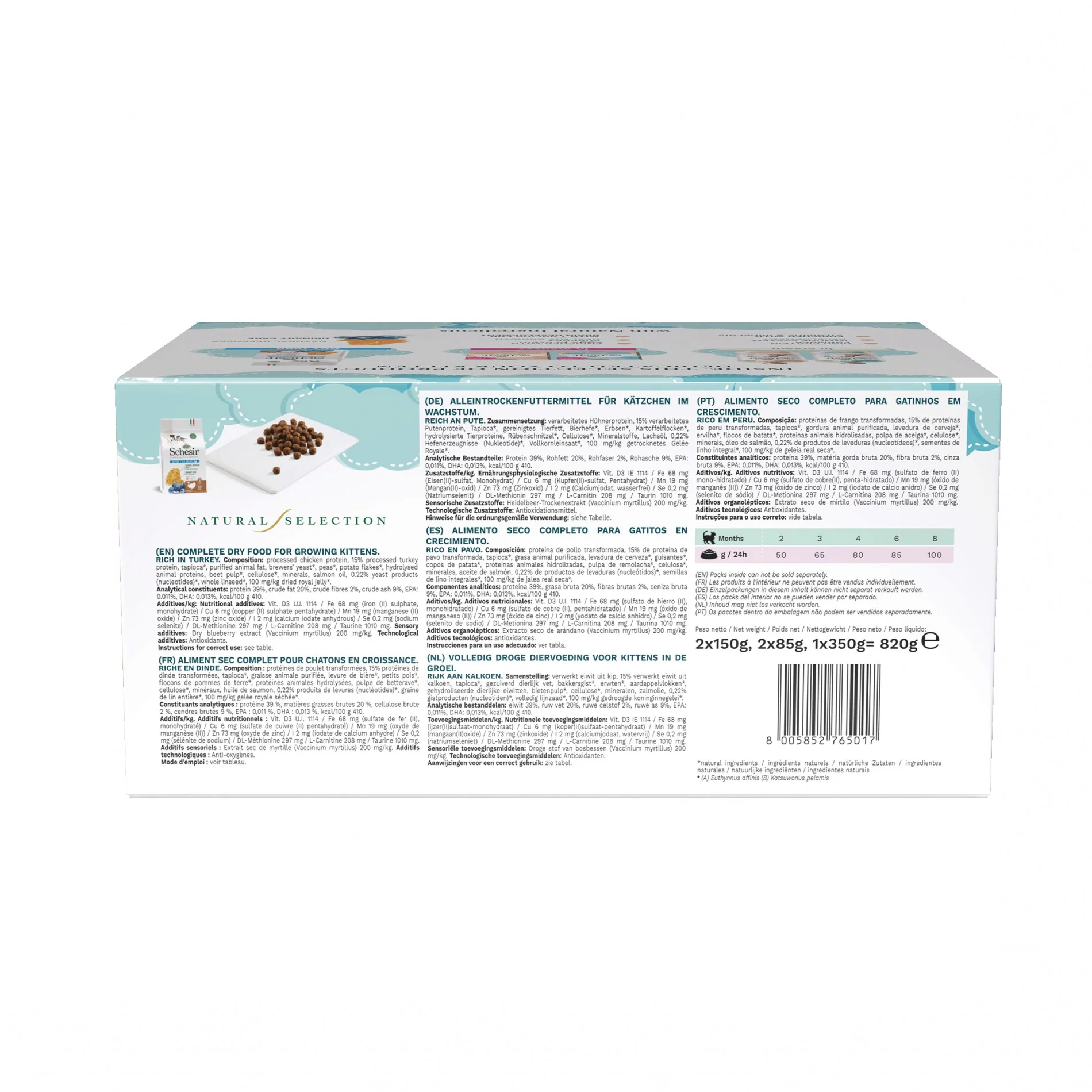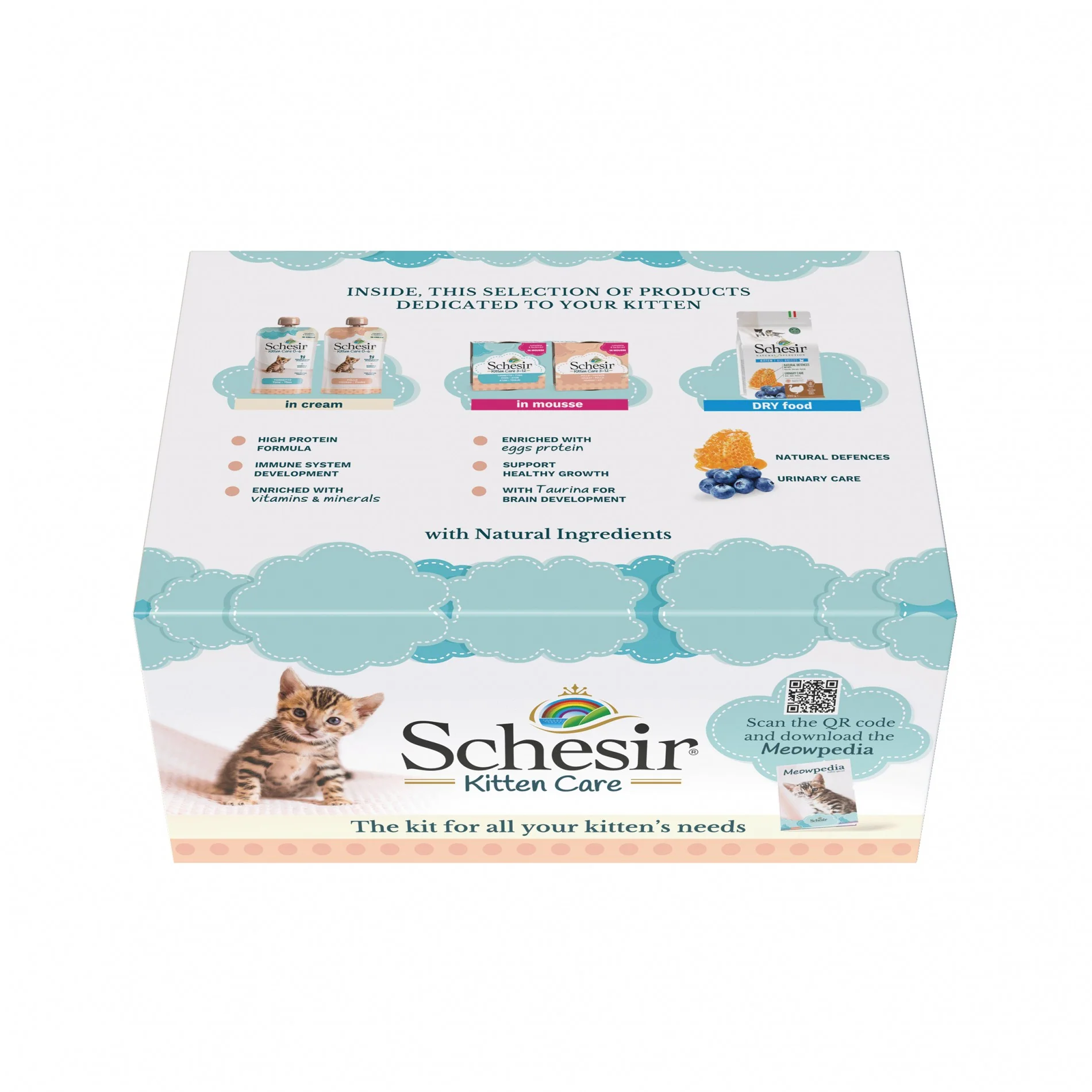 Les aliments Schesir présent dans ce kit sont faits avec des ingrédients 100% naturels. Les produits sont complets, équilibrés et spécifiquement formulés pour les chatons.