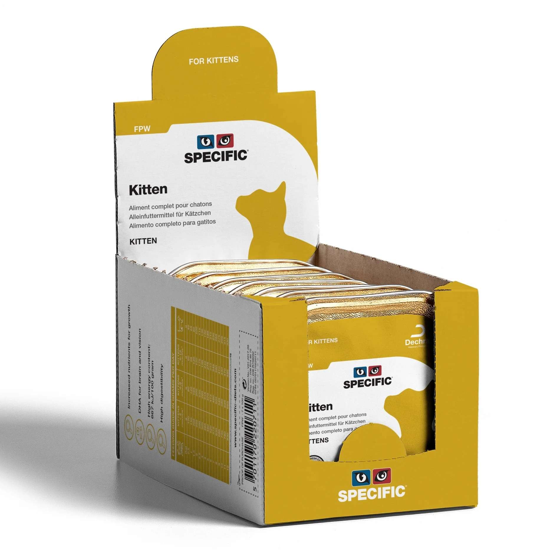 L’aliment humide Specific Kitten est particulièrement adapté aux chatons en croissance pendant la période qui s’étend du sevrage jusqu’à l’âge de 8-12 mois (selon la race ou une éventuelle stérilisation).