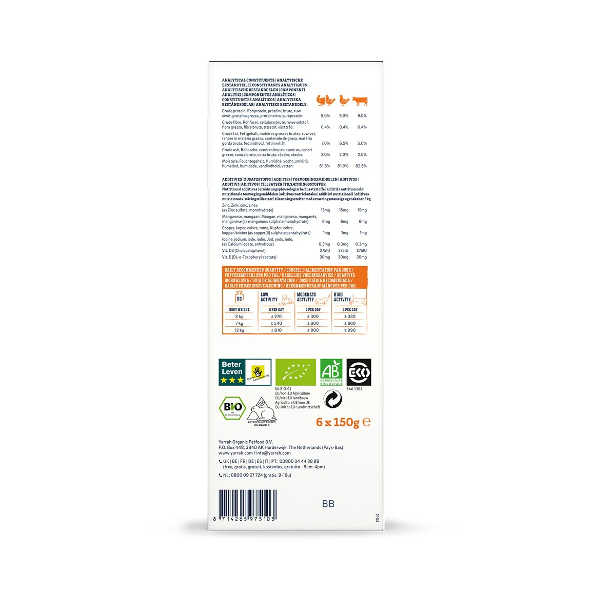 Le Multi Pack Bio Yarrah comporte trois délicieuses pâtées saines, Bio et sans céréales pour les chiens.