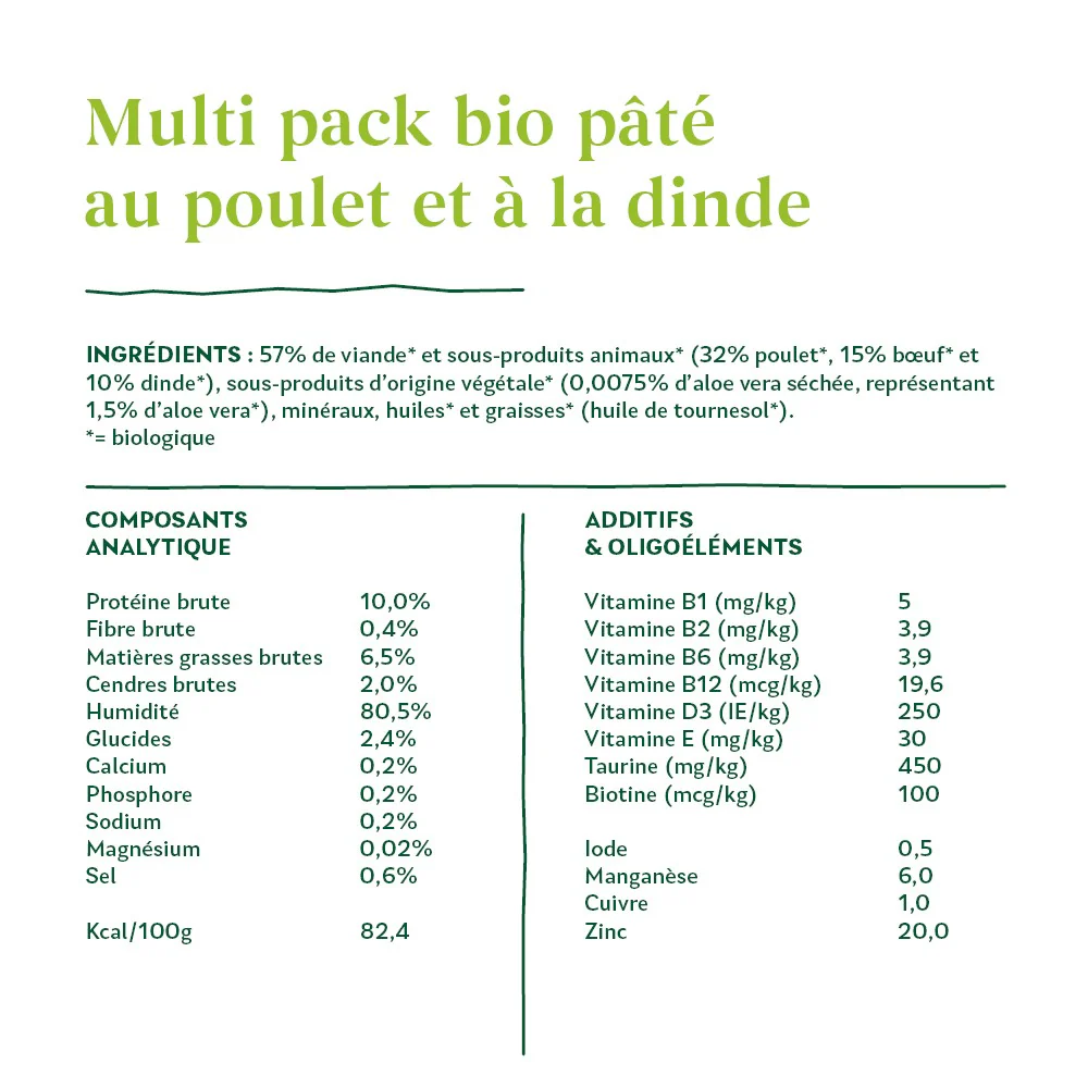 - La recette au poulet et à la dinde contient de l’aloe vera Bio qui est riche en vitamines, minéraux et antioxydants, ce qui renforce le système immunitaire de votre chat. De plus, l’aloe vera est bonne pour la digestion et riche en énergie.