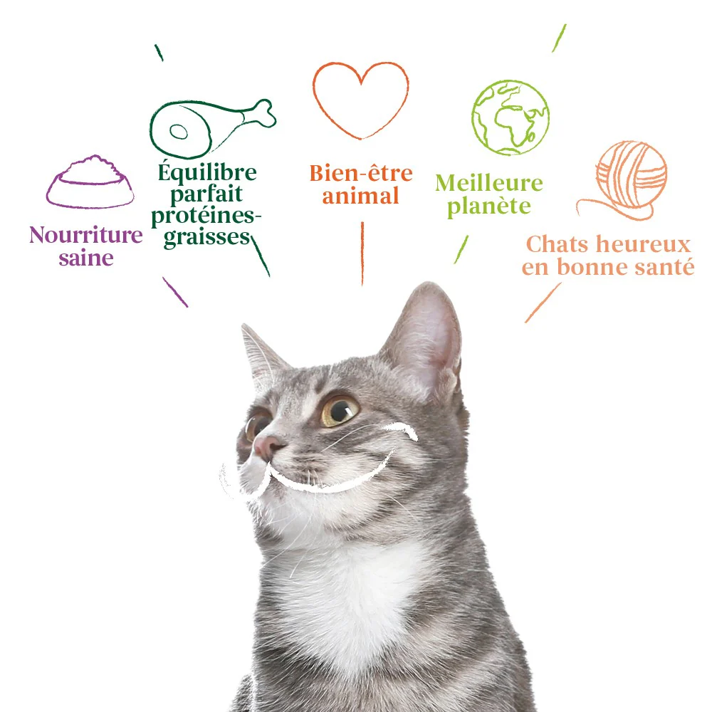 Ces barquettes sont élaborées avec des produits de qualité pour offrir à votre chat une alimentation équilibrée, saine et savoureuse. Sans additifs artificiels, ni pesticides et OGM, chaque recette apporte de bonnes choses à votre petit compagnon :