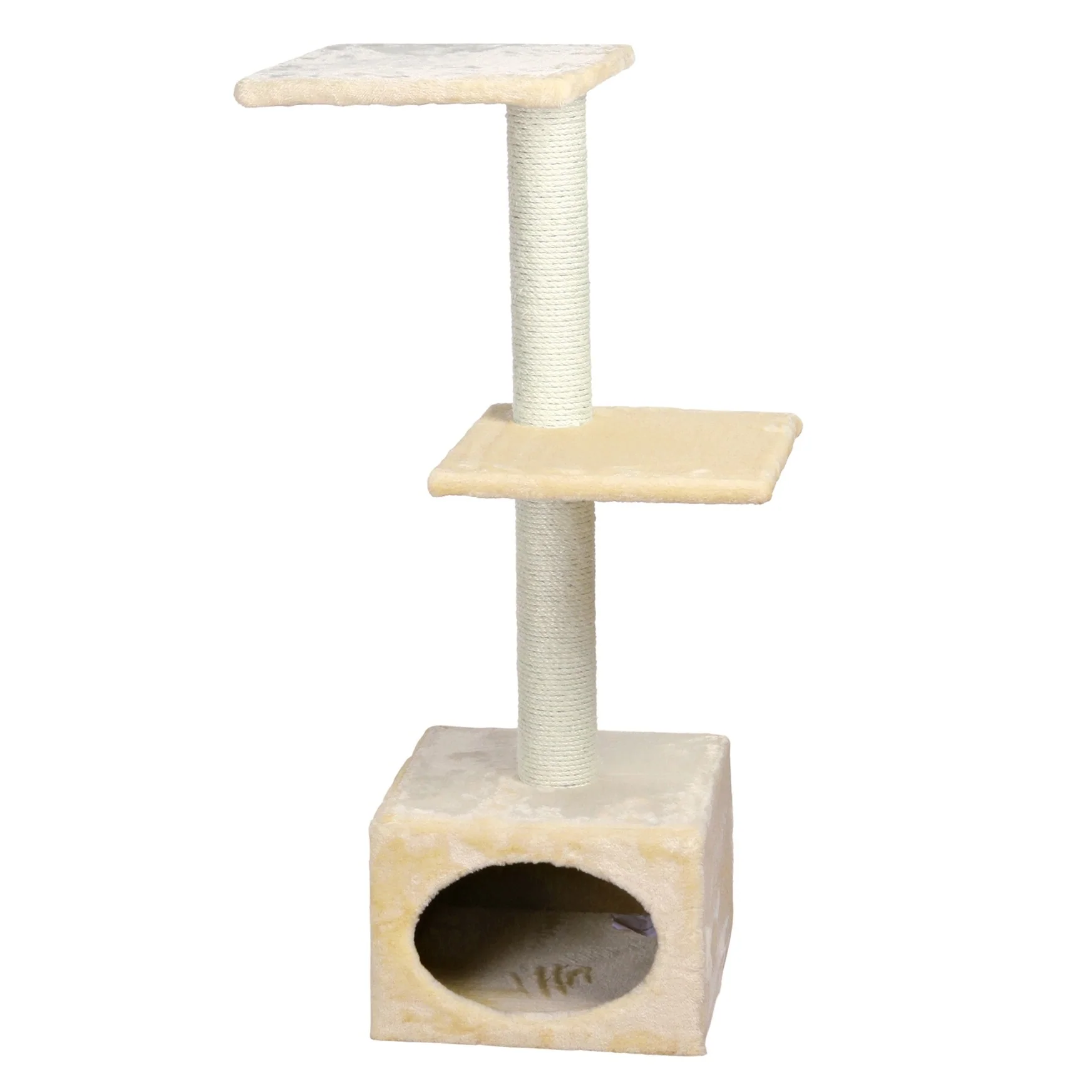 Il est équipé de deux plateformes en hauteur et d’une niche en douce peluche à la base de l’arbre pour abriter les siestes de votre chat.