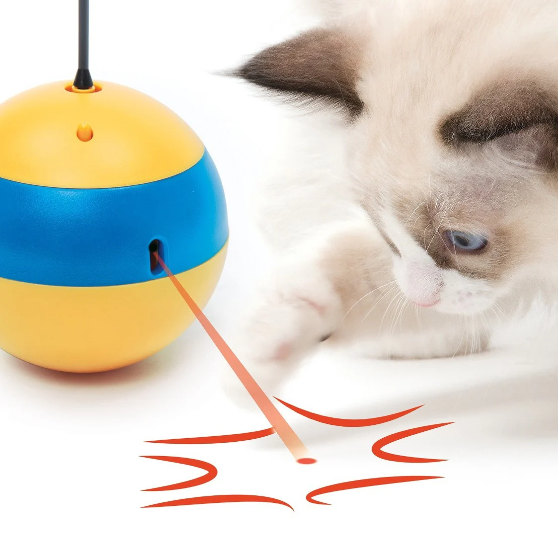 Ce jouet rendra curieux votre boule de poils en tournant rapidement sur lui-même, en projetant des rayons laser et en laissant tomber des friandises.